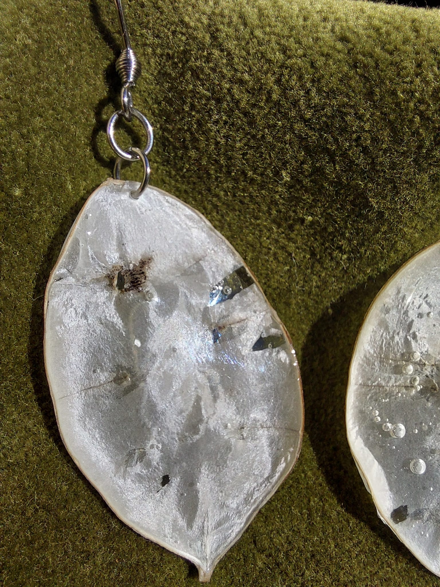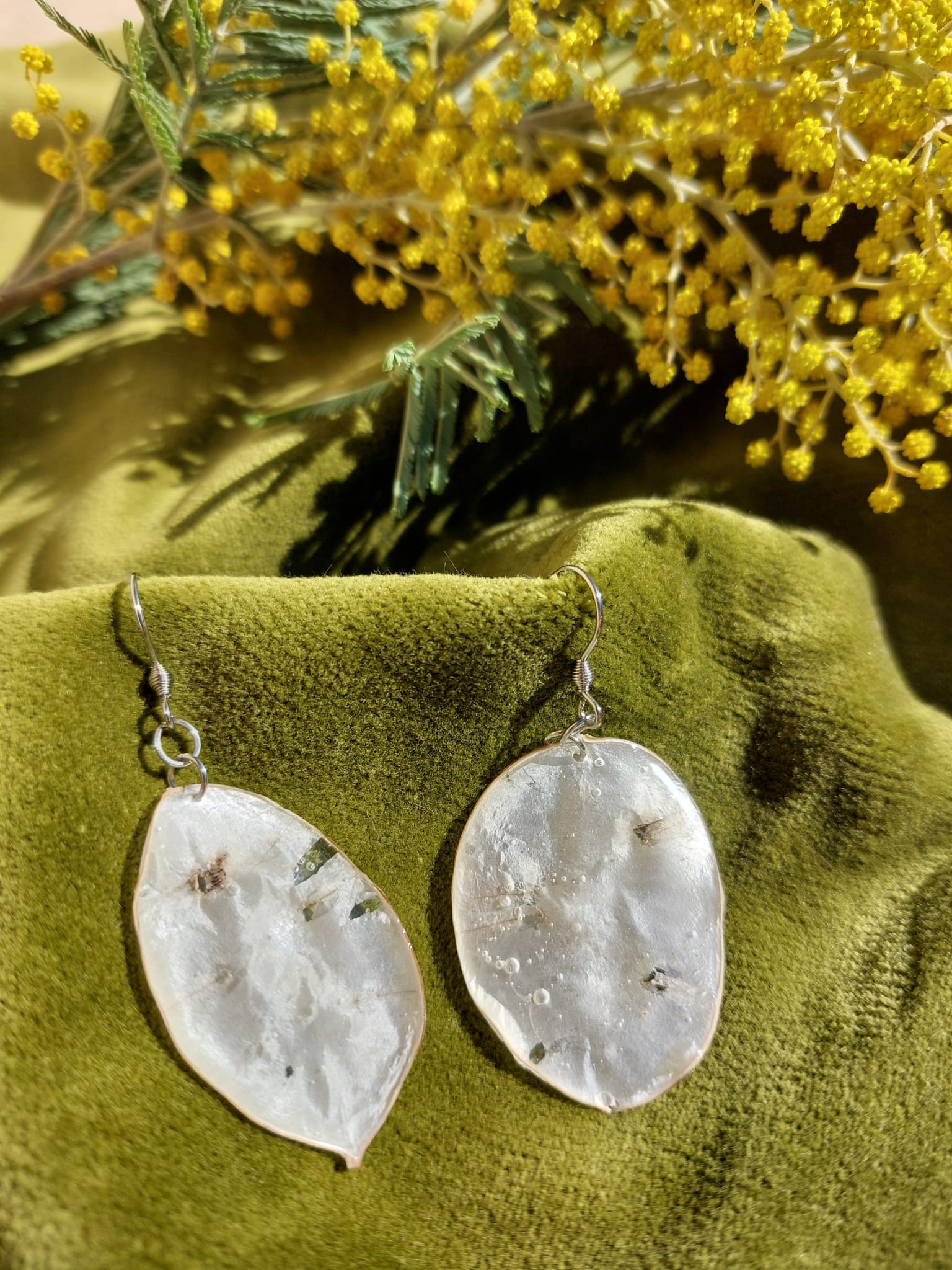 Matières : attaches en acier inoxydable et hypoallèrgénique, résine, feuilles naturelles